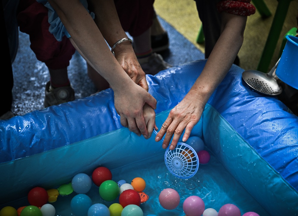 ▲2025年5月29日,重慶師范大學(xué)兒童智能發(fā)展研究中心,孩子在老師和家長的幫助下嘗試用勺子舀起水里的玩具。記者 劉力 攝